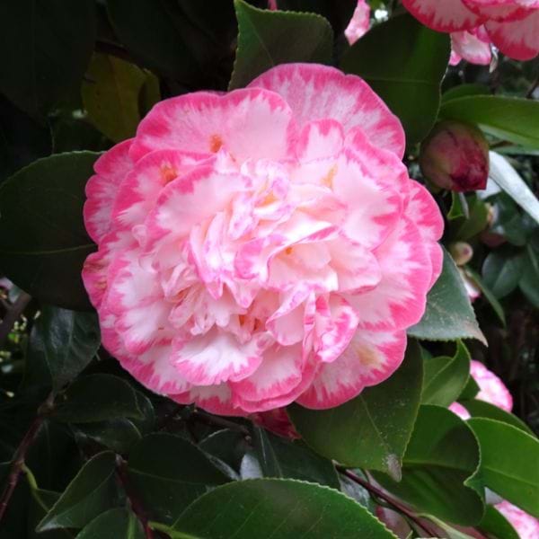The unusual bi-coloured flowers have creamy-white petals edged in raspberry.