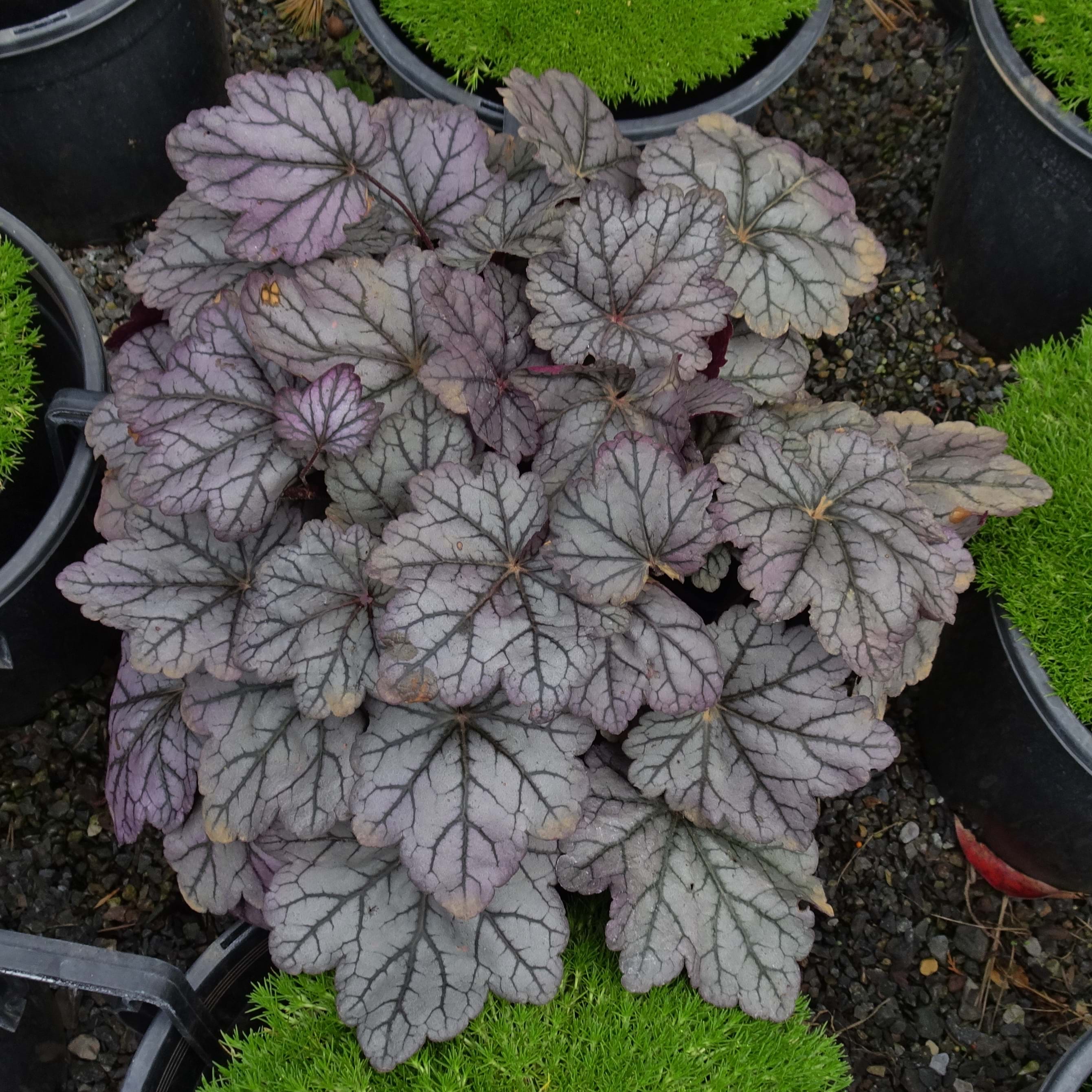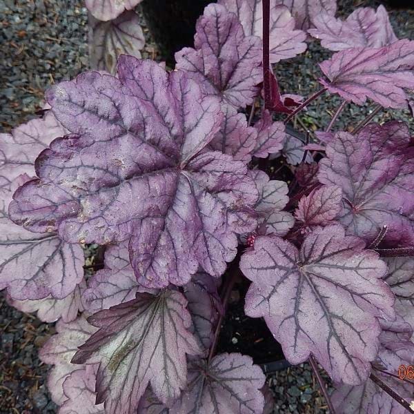 This beautiful heuchera has ruffled frosty silvery purple leaves with darker coloured veins.