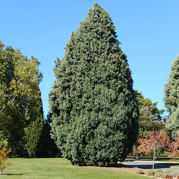 A tall pyramidal conifer with icy-blue, aromatic foliage.
