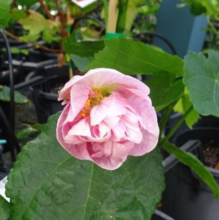 It has ruffled, double mid pink flowers forming along the upright branches.