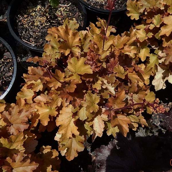 The maple-shaped leaves of this hybrid Heuchera vary in colourĀ from amber to peachy bronze.