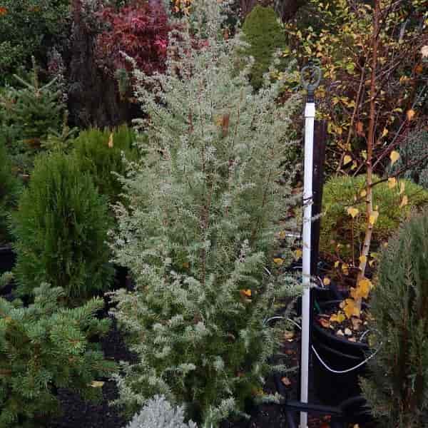 This juniper forms an upright shrub with spikey blue-grey needle-like foliage.